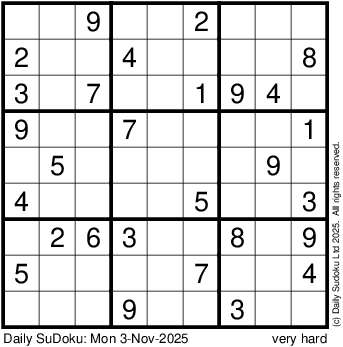 The Daily SuDoku: Mon 3-Nov-2025